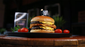 Bułka brioszka, 2x mięso 115g smażone metodą smash, 2x ser cheddar, panierowany ser, ogórek kiszony, sos pikantne mayo, autorski sos bekonowy