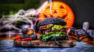 100% wołowiny, czarna bułka, sałata, rukola, pomidor, cebula, słodki ogórek, noodle z cukini, ser mimolette, ser cheddar, bekon, sos autorski